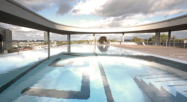 In unserem Studio ELEMENTS Henninger Turm bieten wir Ihnen einen Outdoorpool mit Skylineblick über den Dächern Frankfurts. Der knapp 80 Quadratmeter große Rooftop Pool mit Infinity-Wirkung lädt neben Aquakursen zum Abtauchen und Erfrischen mit atemberaubendem Blick über die Stadt ein.