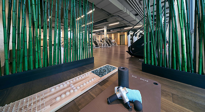 Die Ausstattung umfasst unter anderem Equipment für Fußreflexmassagen sowie eine vielfältige Auswahl an BLACKROLL®-Produkten, darunter Faszienrollen, COMPRESSION BOOTS, FASCIA GUN – Massagepistole und bequeme LOUNGER für maximale Entspannung.