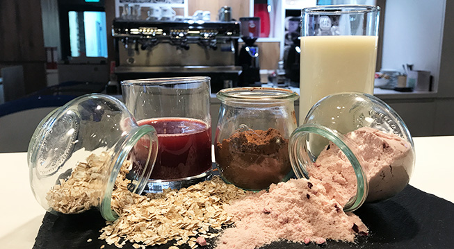 Ob Milch oder Kokoswasser, ob Schoko- oder Vanilleproteinpulver, ob Ananassaft oder Schwarze Johannesbeere, ob Chiasamen oder Kakao – in allen ELEMENTS Studios können Sie sich in nur vier Schritten Ihren individuellen Lieblingsshake zusammenstellen.