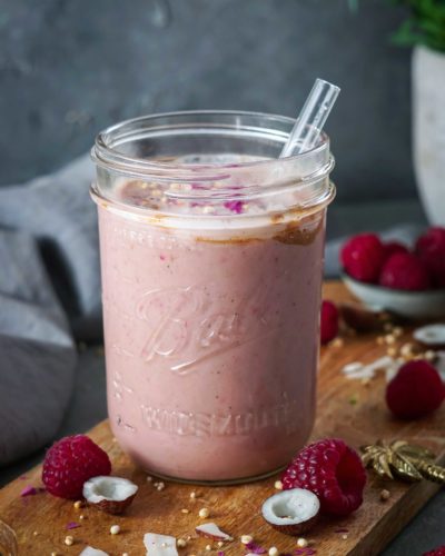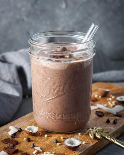 Alle Zutaten in den Mixer geben und verrühren. Nach Geschmack süßen. Optional mit Kokoschips anrichten oder mit Granola und frischen Beeren als Bowl servieren.